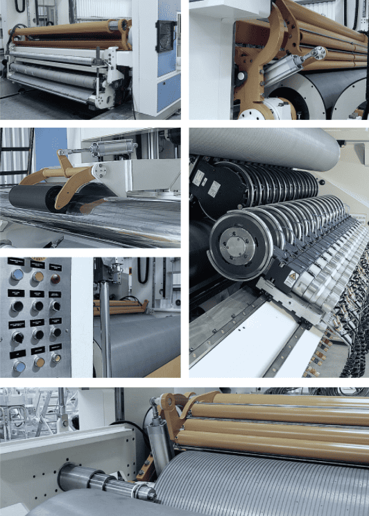 Para garantir a abertura dos múltiplos cortes, a Rebobinadeira é equipada com sistema Tandem, com dois Rolos Curvos com ajuste de posição da curvatura e abraçamento da folha.