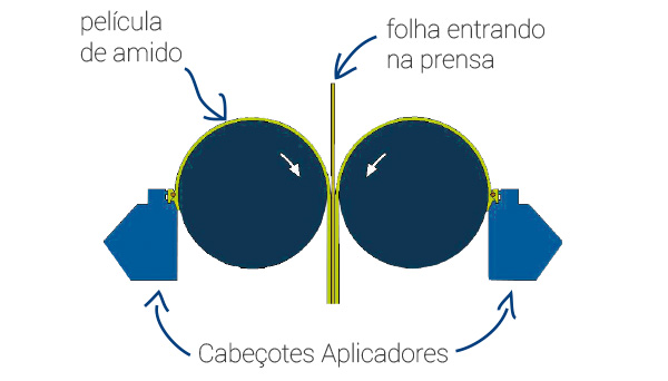 O amido é aplicado nos Rolos da Prensa por Barras Aplicadoras, ranhuradas de acordo com os requerimentos de processo