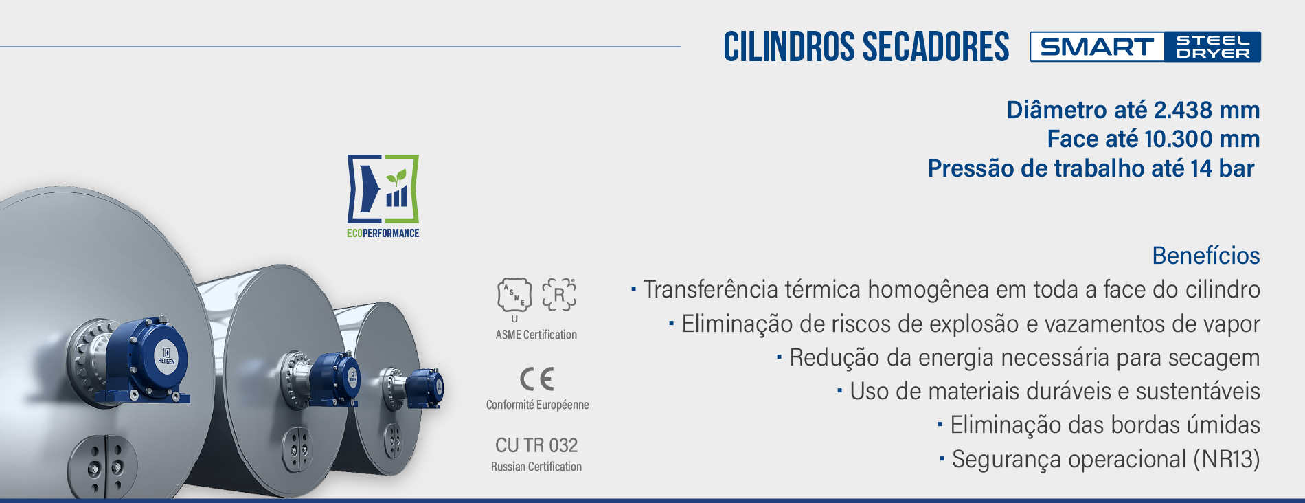 Complementando esta fase, a HERGEN fornecerá uma pós-secagem equipada com os Cilindros Secadores Smart Steel Dryers, desenvolvidos para entregar as melhores taxas de transferência térmica e o menor consumo energético do mercado. Fabricados em aço carbono e produzidos sob rigorosos padrões de qualidade e usinagem exclusiva HERGEN, garantem alta confiabilidade e segurança operacional.